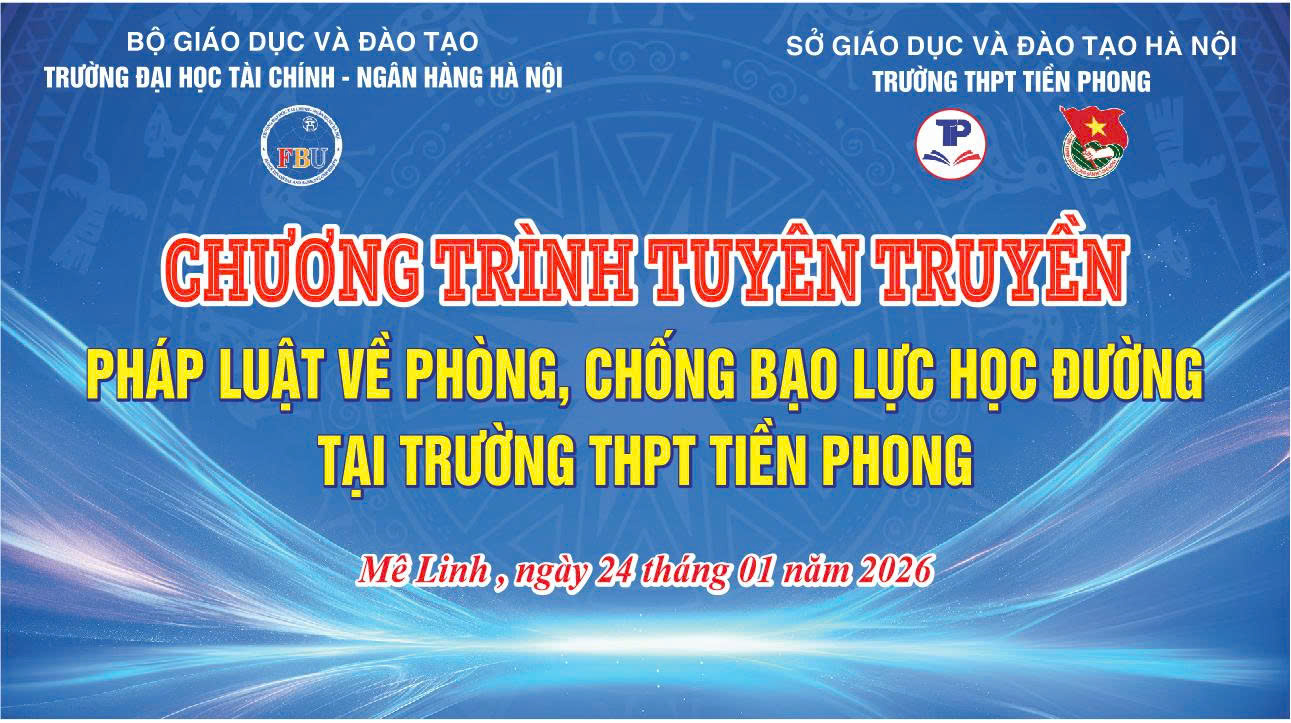 Sáng thứ Bảy, ngày 24/01/2026, tại Trường THPT Tiền Phong, chương trình tuyên truyền pháp luật về phòng, chống bạo lực học đường do Trường Đại học Tài chính – Ngân hàng Hà Nội phối hợp tổ chức đã diễn ra thành công tốt đẹp. Chương trình thu hút sự quan tâm và tham gia đông đảo của cán bộ, giáo viên và học sinh toàn trường.