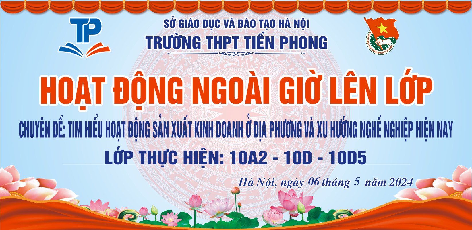 Thực hiện kế hoạch giáo dục của nhà trường năm học 2023-2024. Được sự đồng ý của Chi bộ - BGH nhà trường và BCH Đoàn trường THPT Tiền Phong, chương trình ngoại khóa được tổ chức xuyên suốt trong năm học theo từng chủ đề, chủ điểm của từng tháng gắn với nhiệm vụ học tập trau dồi kiến thức và kỹ năng sống cho mỗi Đoàn viên thanh niên.