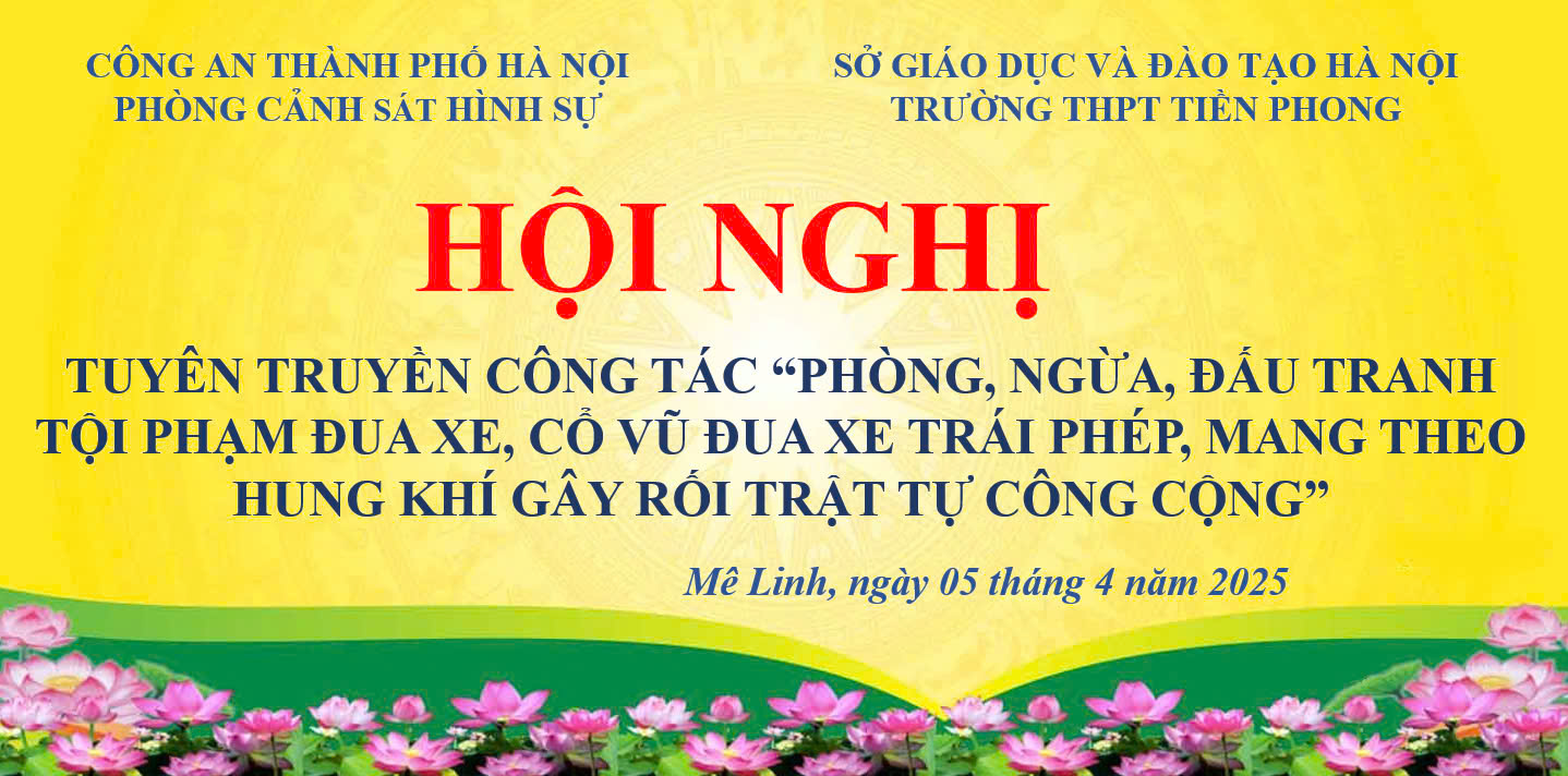 Được sự nhất trí của BGH, sáng thứ 7, ngày 05/4/2025, Phòng cảnh sát hình sự thuộc công an Thành Phố Hà Nội phối hợp với trường THPT Tiền Phong thực hiện hội nghị tuyên truyền công tác “PHÒNG, NGỪA, ĐẤU TRANH TỘI PHẠM ĐUA XE, CỔ VŨ ĐUA XE TRÁI PHÉP, MANG THEO HUNG KHÍ GÂY RỐI TRẬT TỰ CÔNG CỘNG”.