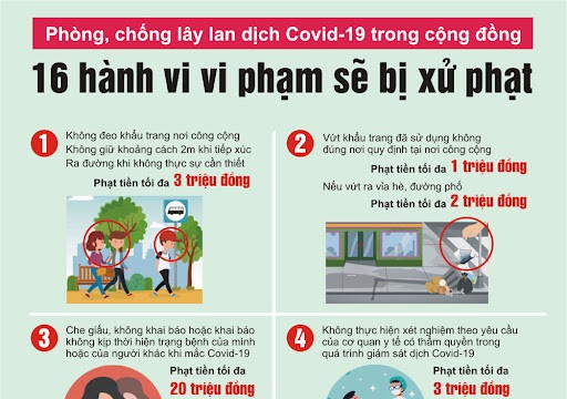 Hiện nay, tình hình dịch bệnh Covid-19 trong toàn quốc nói chung, trên địa bàn Thành phố Hà Nội nói riêng diễn biến ngày càng phức tạp, cùng với đó là các hành vi vi phạm pháp luật liên quan đến công tác phòng chống dịch ngày càng gia tăng. Vì vậy, nhằm giúp công chức, viên chức, người lao động và Nhân dân trên địa bàn tỉnh hiểu rõ một số quy định về mức xử phạt vi phạm pháp luật trong phòng, chống dịch bệnh Covid-19 để nâng cao ý thức tự giác chấp hành, góp phần đẩy lùi dịch bệnh trên địa bàn Thành phố. Nhà trường đăng tải quy định mức xử phạt 16 hành vi vi phạm pháp luật trong phòng, chống dịch Covid-19, cụ thể như sau:
