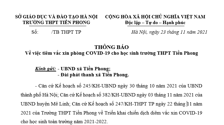 - Căn cứ Kế hoạch số 245/KH-UBND ngày 30 tháng 10 năm 2021 của UBND thành phố Hà Nội; Căn cứ Kế hoạch số 382/KH-UBND ngày 03 tháng 11 năm 2021 của UBND huyện Mê Linh; Căn cứ Kế hoạch số 247/KH-THPT TP ngày 22 tháng 11 năm 2021 của Trường THPT Tiền Phong về Triển khai chiến dịch diêm vắc xin COVID-19 cho học sinh toàn trường năm 2021-2022.